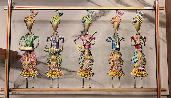 - Handmade paintings, clay sculptures, folk art (like Madhubani, Warli paintings) bring the walls to life.